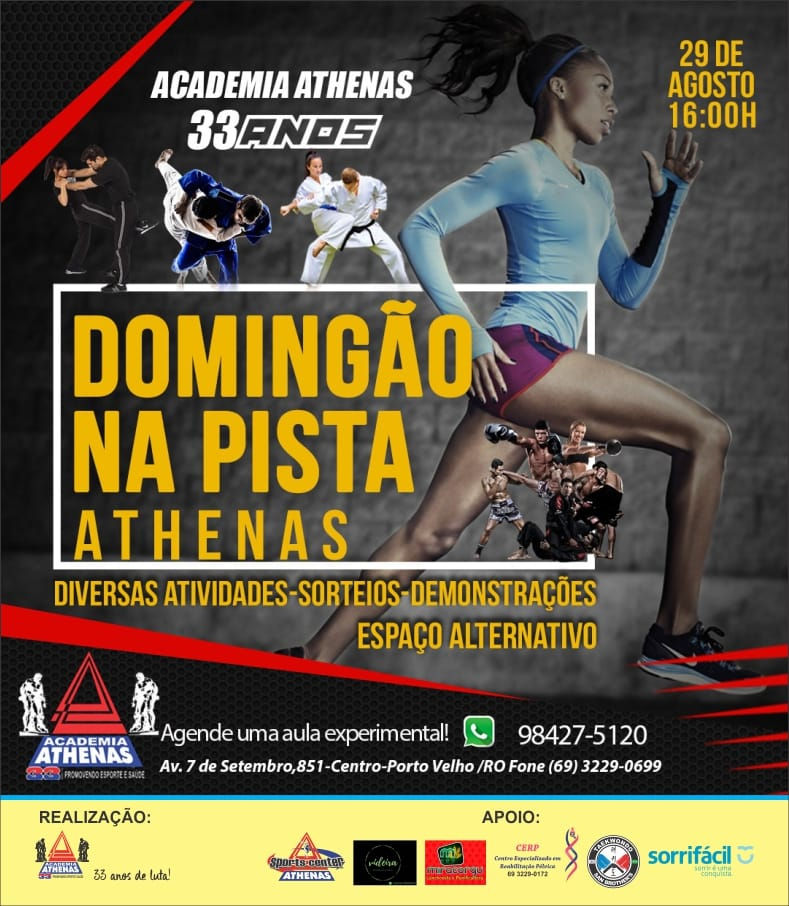 Academia Athenas Esporte Center preparou um aulão para este domingo, dia 29, a partir das 16h, no Espaço Alternativo de Porto Velho. Os participantes do evento serão os atletas do Judô, jiu-jitsu, kickbox, box, entre outras modalidades que a academia oferece.