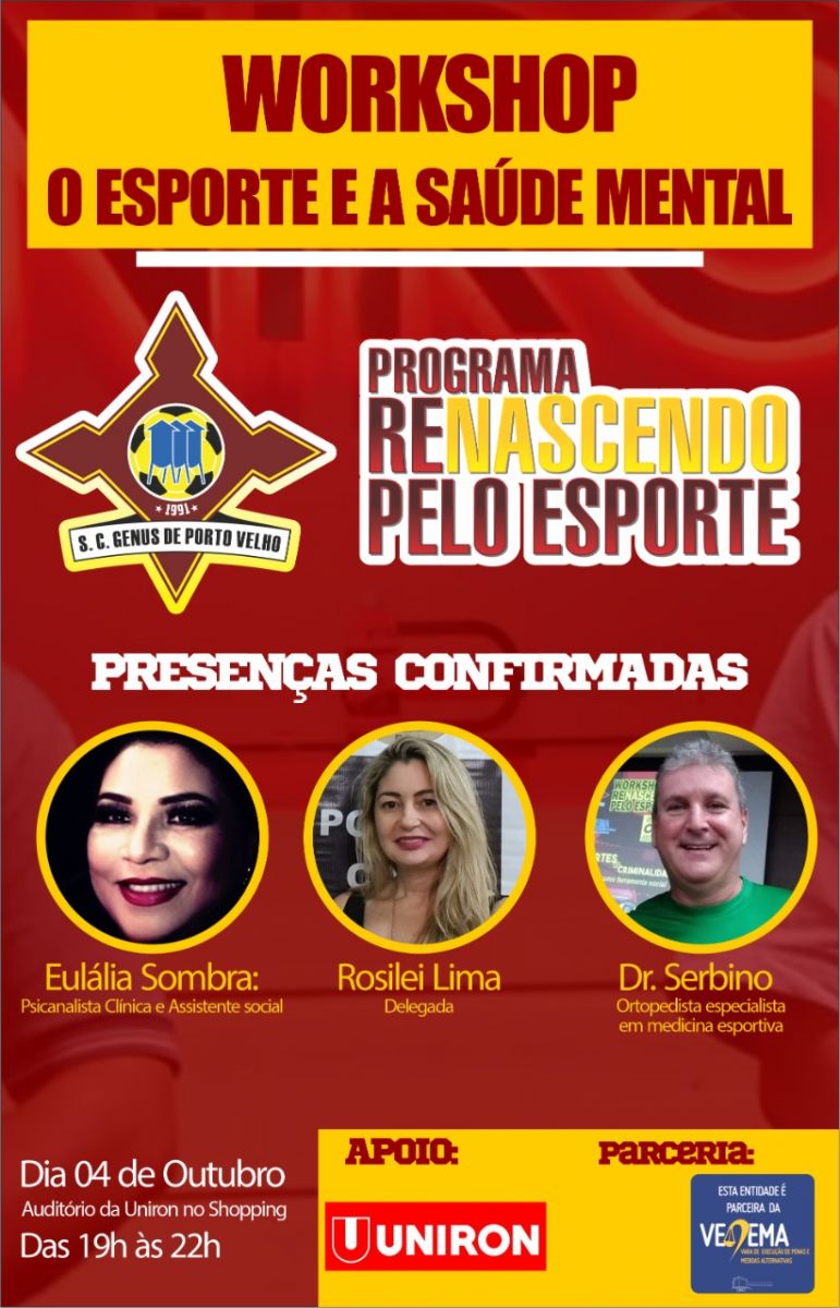 O Sport Clube Genus realizará, no próximo dia 4 de outubro, um Workshop no auditório da Uniron do Porto Velho Shopping. Um dos temas principais envolverá à saúde mental, já confirmados como palestrantes está a psicanalista clínica Dra. Eulália Sombra Pinheiro. Ela é referência em suicidologia.