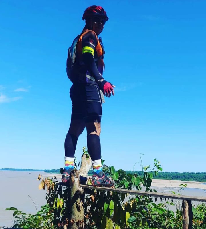 O atleta posa com o Rio Madeira ao fundo, após um dos seus "longões" de bicicleta - Foto: Arquivo Pessoal