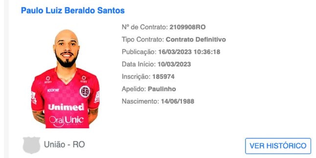 Paulinho já apareceu no BID da CBF e já pode jogar contra o Real Ariquemes - Reprodução