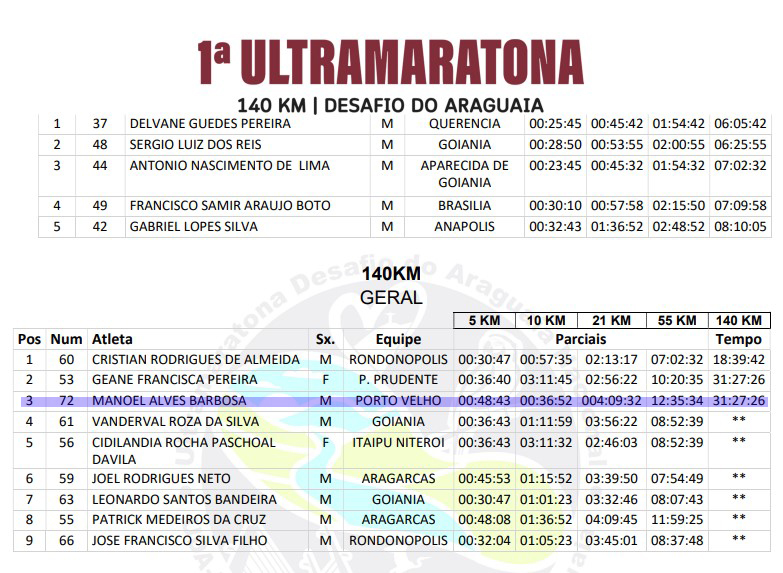 O Ultramaratonista Manoel Alves Barbosa, atleta da Federação do Atletismo de Rondônia esteve em Goiás nestes últimos dias (14) e (16) de julho para participar da 1ª Ultramaratona - Desafio Araguaia 140km e representou Rondônia ao concluir o desafio e trazer sua medalha para a capital.