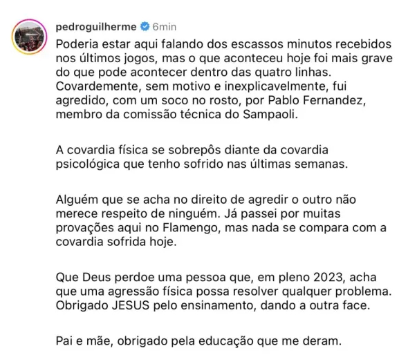 “Poderia estar aqui falando dos escassos minutos recebidos nos últimos jogos, mas o que aconteceu hoje foi mais grave do que pode acontecer dentro das quatro linhas“, disse o jogador, em pronunciamento no Instagram. “A covardia física se sobrepôs diante da covardia psicológica que tenho sofrido nas últimas semanas“, complementa Pedro, apontando uma possível relação já desgastada com o preparador.