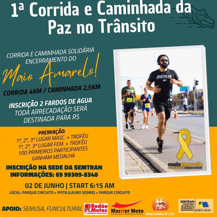 As inscrições para a 1ª Corrida e Caminhada da Paz no Trânsito seguem até esta quarta-feira (29), e podem ser feitas neste formulário on-line, entretanto a confirmação da inscrição se dá com a entrega de dois fardos de água na sede da Semtran até a mesma data.