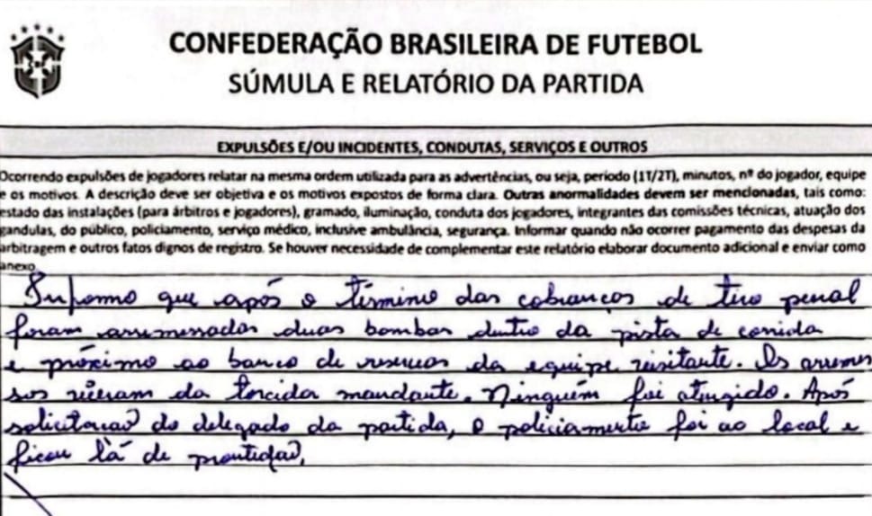O fato foi registrado pelo árbitro, Marcos Felipe Martins Machado, no relatório da partida. “Após a solicitação do delegado da partida, o policiamento foi até o local e ficou lá de prontidão”, relatou Machado no ofício.