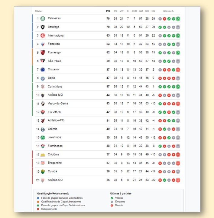 Com 35 rodadas completadas nesse final de semana, o Campeonato Brasileiro de Futebol 2024 esquenta a disputa pelo G6 e aumenta o desespero dos torcedores de clubes que podem entrar na Z4, a zona de rebaixamento para a segunda divisão.