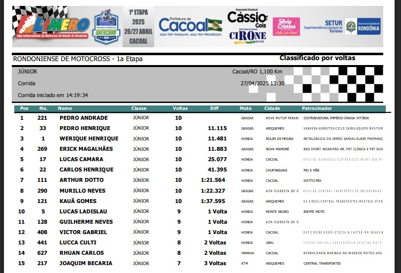 Na categoria Junior, Pedro Andrade #221 de Nova Mutum garantiu o lugar mais alto do pódio. Em segundo Pedro Henrique #33 (Ariquemes) e na terceira posição Werique Henrique #1 de Rolim de Moura.