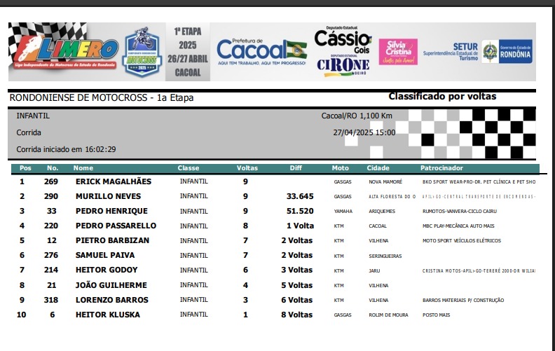Na categoria Infantil, Erick Magalhães #269 (Nova Mamoré) sagrou-se campeão da etapa, seguido de Murillo Neves #290 (Alta Floresta do Oeste) e Pedro Henrique #33 de Ariquemes. A diferença de Erick para o terceiro colocado somou quase um minuto, mostrando a excelente fase do piloto, que será o representante de Rondônia no Arena Cross em São Paulo em breve.