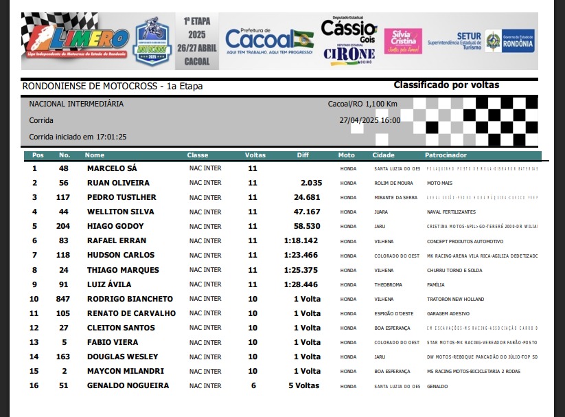Na importada MX3, vitória do mato-grossense de Juara, piloto Romario Rosa #691, seguido de Jacson Cardoso #187 de Vilhena e em terceiro o portovelhense Eder Stenzel #11.