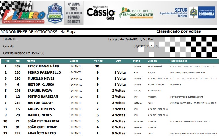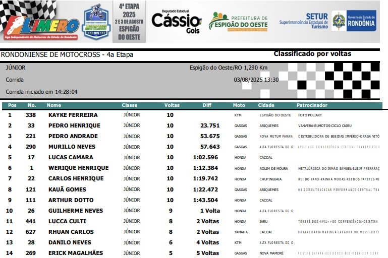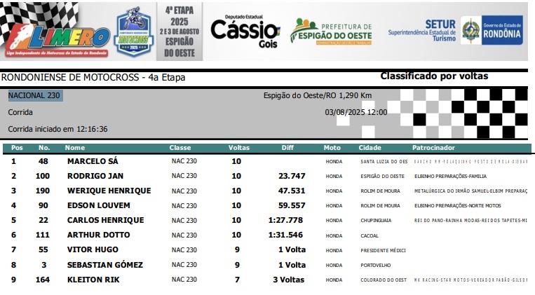 Espigão D'Oeste reuniu os melhores pilotos de Rondônia em 11 categorias disputadas: Importada MX3, Importada MX4, Importada Pro, Importada Iniciante, Nacional 230, Nacional Intermediária, Nacional Pro / MX3, Feminina, Mirim, Júnior e Infantil.