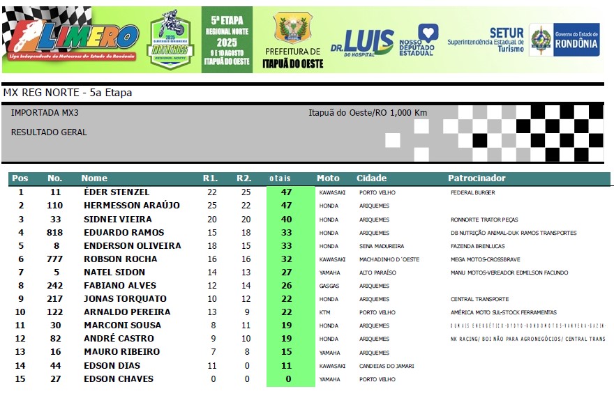Ariquemes ficou também com a terceira e quarta colocação da MX3, com Sidney Vieira #33 e Eduardo Ramos #888. A quinta posição foi a sena Madureira (Acre) com o piloto Enderson Oliveira #08.