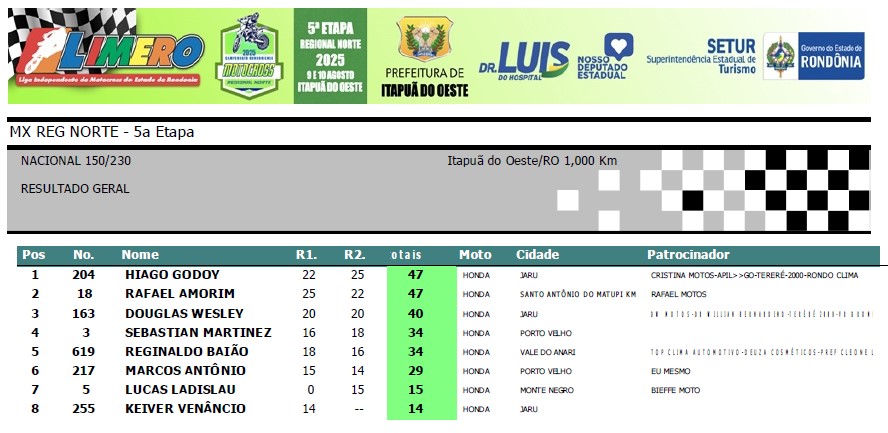 Vitoria de Hugo Amaral #1 de Porto Velho que venceu as duas baterias com certa tranquilidade. Na segunda posição, outro piloto de Porto Velho Eder Stenzel #11 que protagonizou uma disputa eletrizante com piloto Hermerson Araújo #110 de Ariquemes, mostrando que ambos estão em excelente fase. Completaram o pódio Alisson Zanella #200 de Manaus e Sidnei Vieira #33 (Ariquemes)
