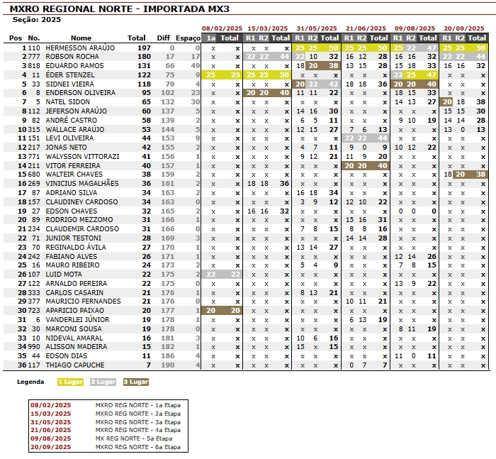 Mostrando regularidade ao longo da temporada, Hermesson Araújo (#110, Ariquemes) também garantiu a taça da MX3, somando 197 pontos. O vice ficou com Robson Rocha (#777, Machadinho D’Oeste), que chegou aos 180, e em terceiro terminou Eduardo Ramos (#818, Ariquemes), com 131