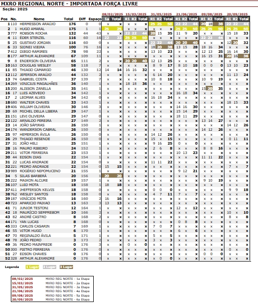 A categoria mais equilibrada do campeonato terminou com vitória apertada: Hermesson Araújo (#110, Ariquemes) levou o título com 176 pontos, apenas um a mais que Hugo Amaral (#1, Porto Velho), vice-campeão com 175. Robson Rocha (#777, Machadinho D’Oeste) fechou o ano em terceiro, com 132