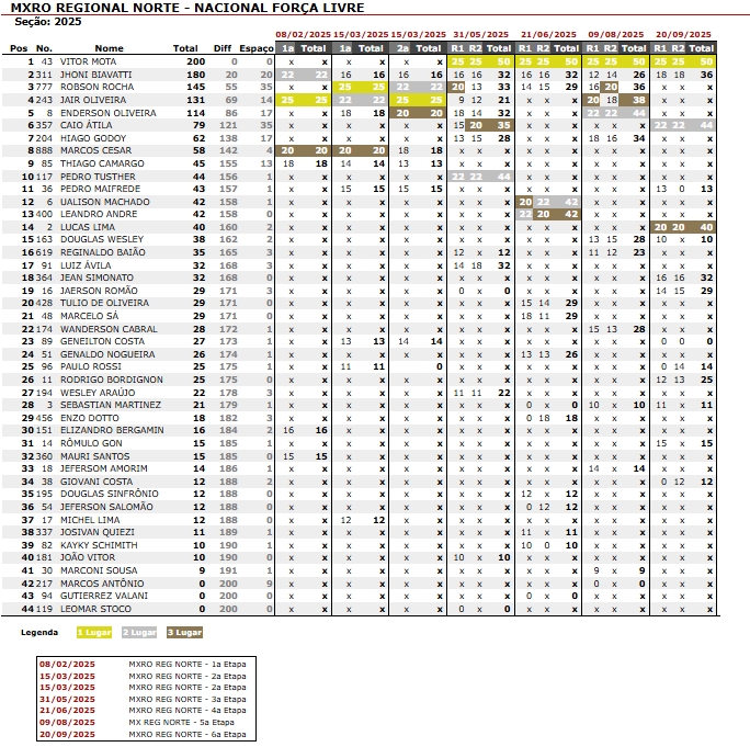 O grande destaque foi Vítor Mota (#43, Buritis), que venceu todas as etapas e conquistou o título de forma invicta, alcançando 200 pontos. O vice foi Jhoni Biavatti (#311, Nova Califórnia), com 180, enquanto Robson Rocha (#777) encerrou em terceiro com 145