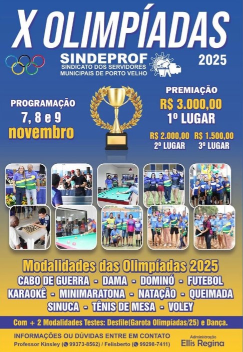 O serviço público municipal de Porto Velho se prepara para celebrar a décima edição das Olimpíadas do SINDEPROF, um marco que consolida o evento como um dos maiores e mais importantes encontros esportivos da categoria na capital e no Estado. A 10ª edição das Olimpíadas do Sindeprof, em Porto Velho, acontecerá nos dias 7, 8 e 9 de novembro de 2025, na sede social do sindicato.