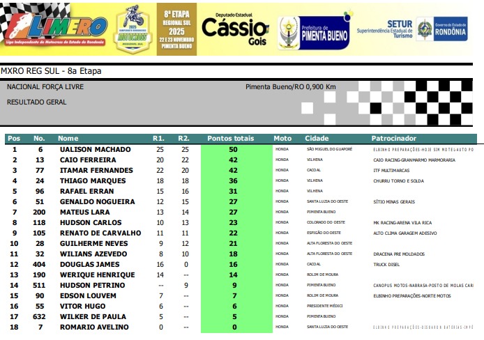 Confira abaixo os resultados por categoria da final do Regional Sul de Motocross de Pimenta Bueno.