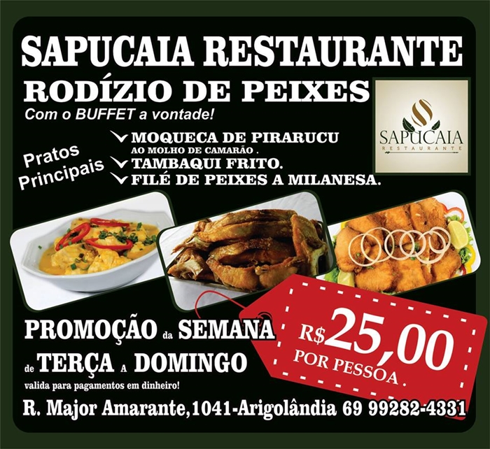 Aberto de terça-feira a domingo o restaurante Sapucaia conta com o melhor rodizio de peixes da cidade por apenas às R$ 25 o melhor cardápio da cidade.