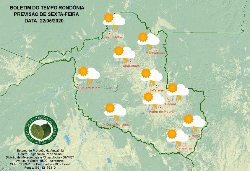 As temperaturas caem e em Porto Velho e Ariquemes não passa dos 28°C. Ji-Paraná, Theobroma e Ouro Preto do Oeste registram 27°C. Santa Luzia e São Felipe do Oeste marcam 26°C. Chupinguaia, Costa Marques, Guajará-Mirim e Vilhena a mínima será de 17°C. As informações são do Sistema de Proteção da Amazônia (Sipam).