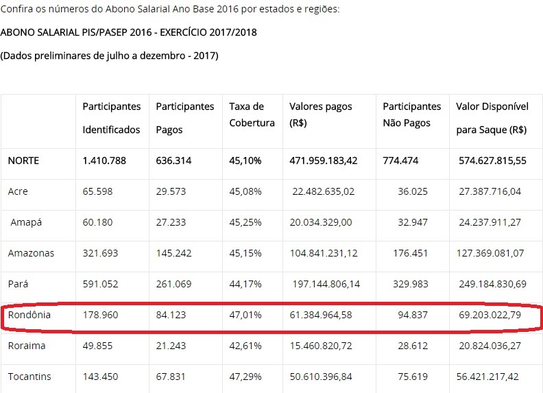 Em Rondônia, segundo dados do Ministério do Trabalho, quase 95 mil trabalhadores ainda não compareceram para receber o benefício, um total de 69,2 milhões.