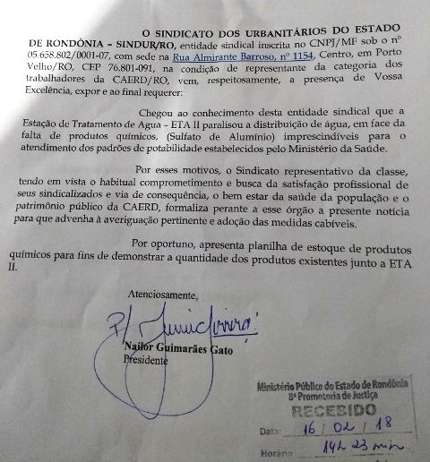 A 8ª promotoria de justiça do MP/RO recebeu a denúncia na tarde do último dia (16) e a sociedade tem a esperança que este problema na CAERD possa ser solucionado o quanto antes. Pois Água é saúde e não doença.