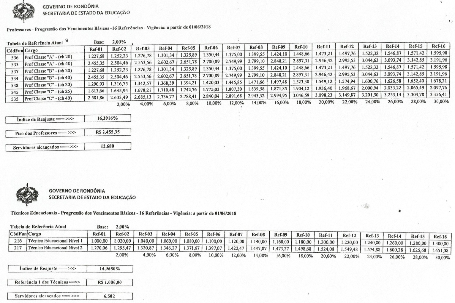 Logo após as negociações que resultaram no encerramento da greve que durou 45 dias, o Sintero, por precaução havia divulgado tabela salarial dos Professores estaduais considerando o piso salarial nacional no início de carreira para todas as classes.