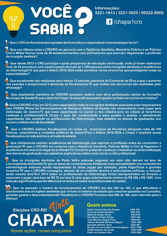 Já na reta final e a Chapa 1 que concorre ao pleito já se mobiliza para o grande dia. Amanhã, dia 04 de maio todos os profissionais da Odontologia que estão aptos a votar escolherão, através de voto online, a equipe que estará à frente do Conselho Regional de Odontologia (CRO) de Rondônia para o Biênio 2018-2020. “Ficamos felizes porque conseguimos realizar uma campanha limpa e transparente” destaca Hailton Cavalcante dos Santos, atual presidente do CRO e integrante da Chapa 1.