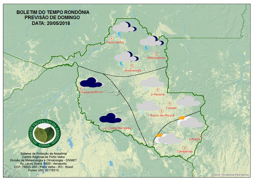 A Divisão de Meteorologia do Sistema de Proteção da Amazônia informa que o domingo será de muitas nuvens e poucas chuvas em todo Estado. No cone sul o céu deve variar de nublado a parcialmente nublado e não há previsão de chuvas, assim como no vale do Guaporé, onde o céu que amanhece encoberto tendendo a abrir, ficando nublado no decorrer do dia. O Leste do Estado terá o céu nublado durante todo o domingo e deve haver chuvas ocasionais nessa região. Na região norte e na Capital Porto Velho, o tempo deve variar entre nublado a encoberto e a previsão é de pancadas ocasionais de chuva. Na capital Porto Velho, as temperaturas não devem ultrapassar os 23°C nesse domingo.