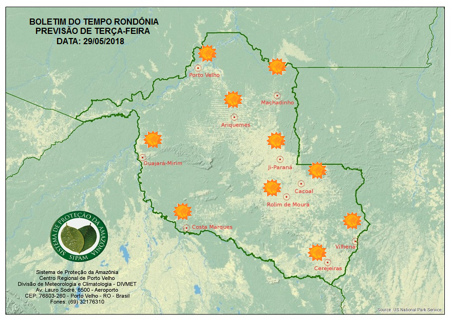 A Divisão de Meteorologia do Sistema de Proteção da Amazônia informa que nessa terça-feira é esperado céu claro e tempo firme em todo Estado. Não há previsão de chuvas em todas as regiões.