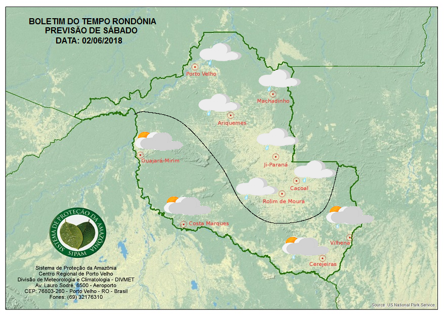 A Divisão de Meteorologia do Sistema de Proteção da Amazônia informa que a massa de ar fria e seca se estabelece sobre a região deixando o tempo com temperaturas agradáveis para os que gostam mais do frio. Não há previsões de ocorrência de chuvas por todo Estado, mesmo o céu do centro norte do Estado e vale do Guaporé amanhecendo com algumas nuvens, que logo devem desaparecer do céu deixando-o claro. O centro-sul do Estado já deve ter condições de céu claro logo pela manhã, perdurando por todo o domingo.