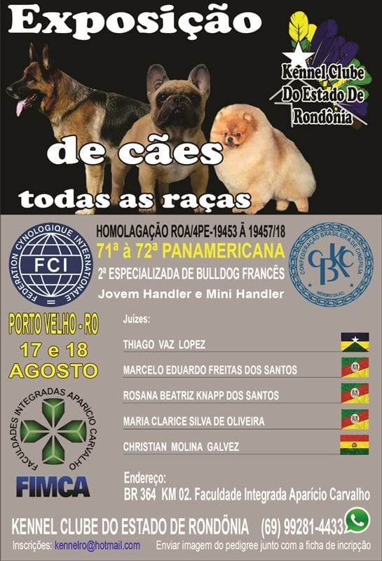 Nos dias 17 e 18 de agosto acontecerá a exposição de cães de todas as raças na Faculdade Integrada Aparício Carvalho em Porto Velho, Rondônia.