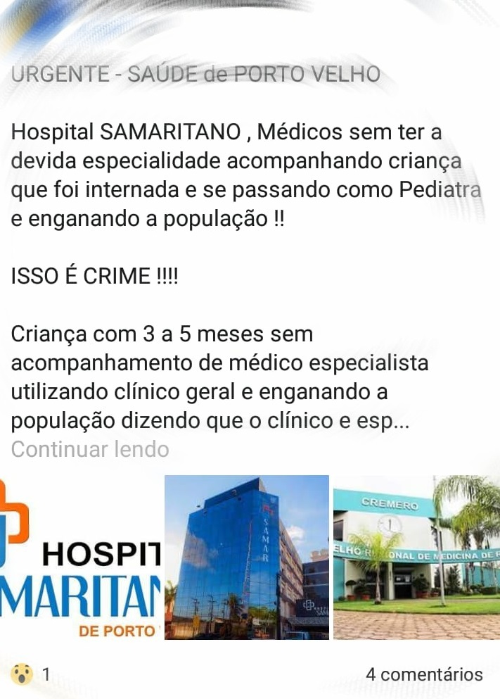 O Hospital buscou a justiça e conseguiu nesta quarta-feira (20) uma liminar o na 1ª vara cível do Tribunal de Justiça de Rondônia (TJ/RO) para que a postagem seja retirada do ar.