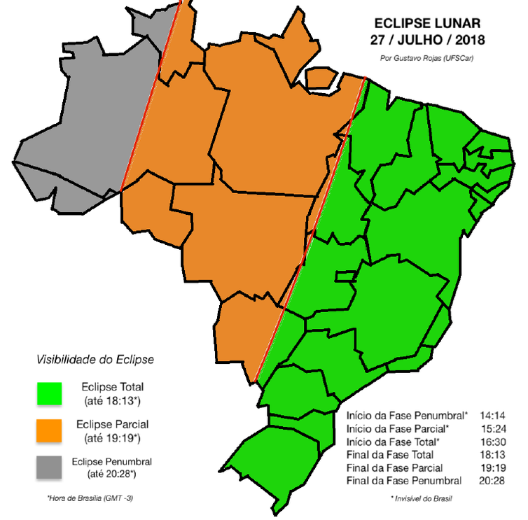 “Quando já estiver bem escuro, a lua vai estar escondida e vai ter um tom mais avermelhado. Assim que a lua nascer, por volta de 18h, vai ser possível conferir a lua escondida. Assim que o sol sumir, as pessoas vão conseguir ver a lua avermelhada”, explica Brito. Em regiões mais no centro do país, como em Brasília, esse aspecto não deve ficar tão perceptível.