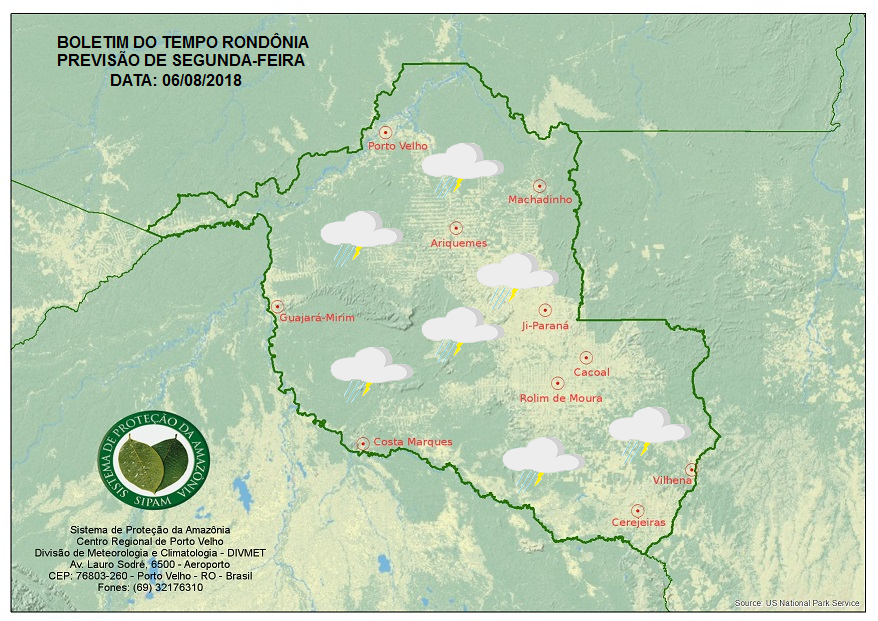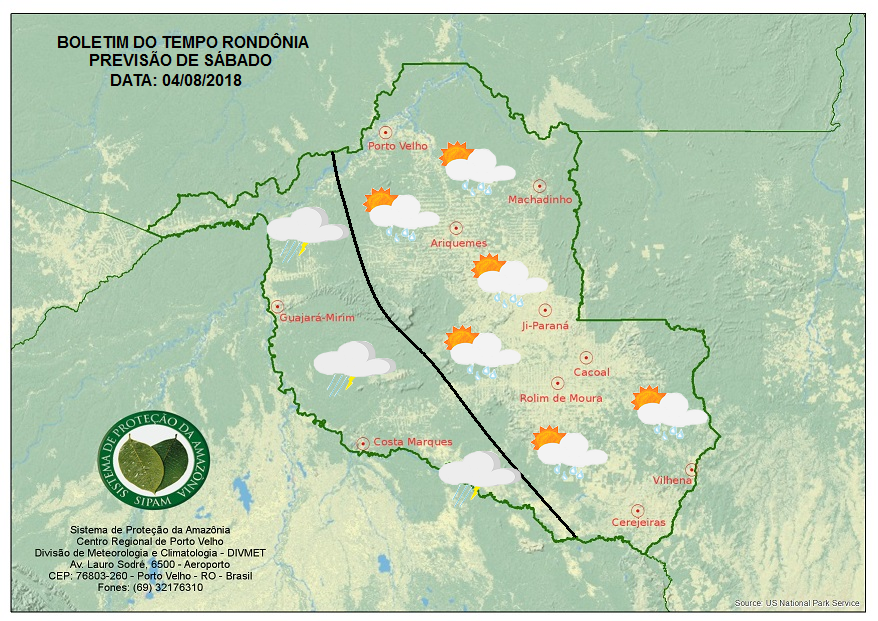 A instabilidade aumenta em Rondônia, devido a aproximação de uma frente fria ao Estado. Neste sábado, a previsão é de um dia quente e abafado em todas as áreas. No Vale do Guaporé, o tempo varia de parcialmente nublado a nublado, com pancadas isoladas de chuva e trovoadas a partir da tarde. Na Capital e nas demais regiões do Estado, o tempo varia de claro a parcialmente nublado, com possibilidade de chuva passageira a tarde.