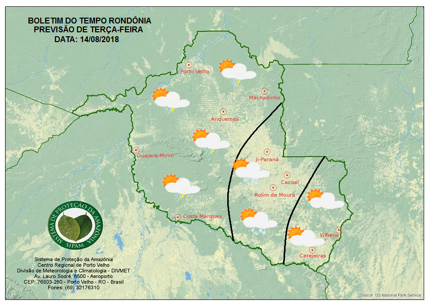 Na capital, no Vale do Jamari e no Vale do Guaporé há previsão de pancadas isoladas de chuva com trovoadas a partir da tarde. Já no extremo sul do estado não há previsão de chuva. Nas demais regiões de Rondônia há possibilidade de chuva passageira a tarde.