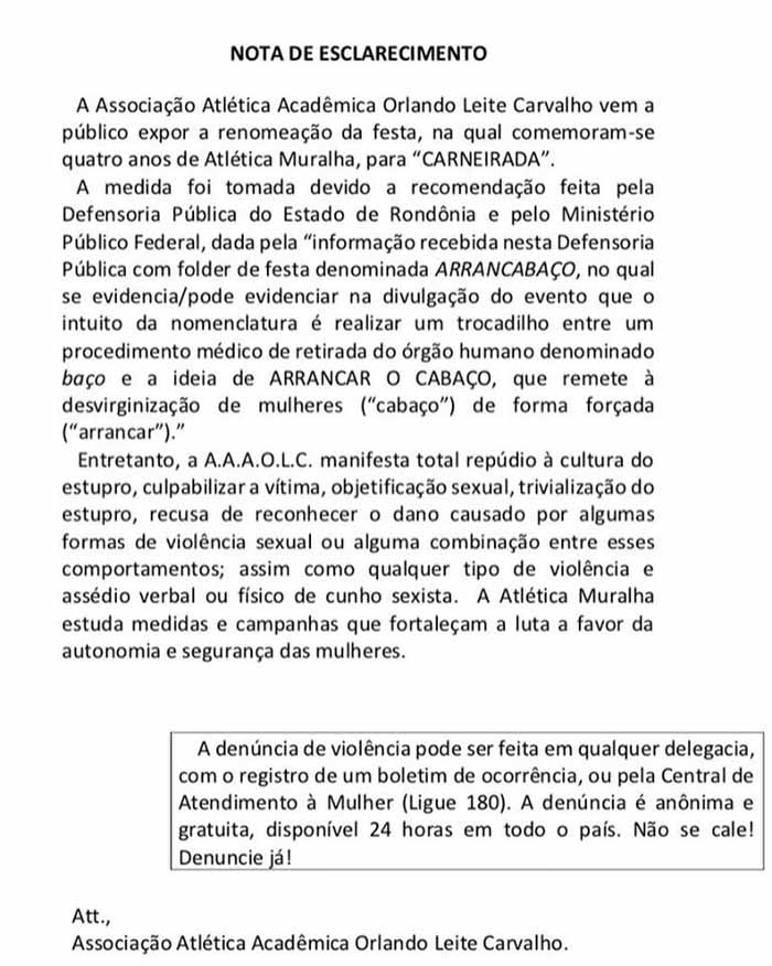 Recomendação conjunta assinada por membros do Ministério Público Federal (MPF/RO) e da Defensoria Pública do Estado (DPE/RO) fez com que a Associação Atlética Acadêmica Orlando Leite Carvalho (AAAOLC), conhecida como Atlética Muralha, alterasse o nome da festa que irá comemorar seus quatro anos de existência.