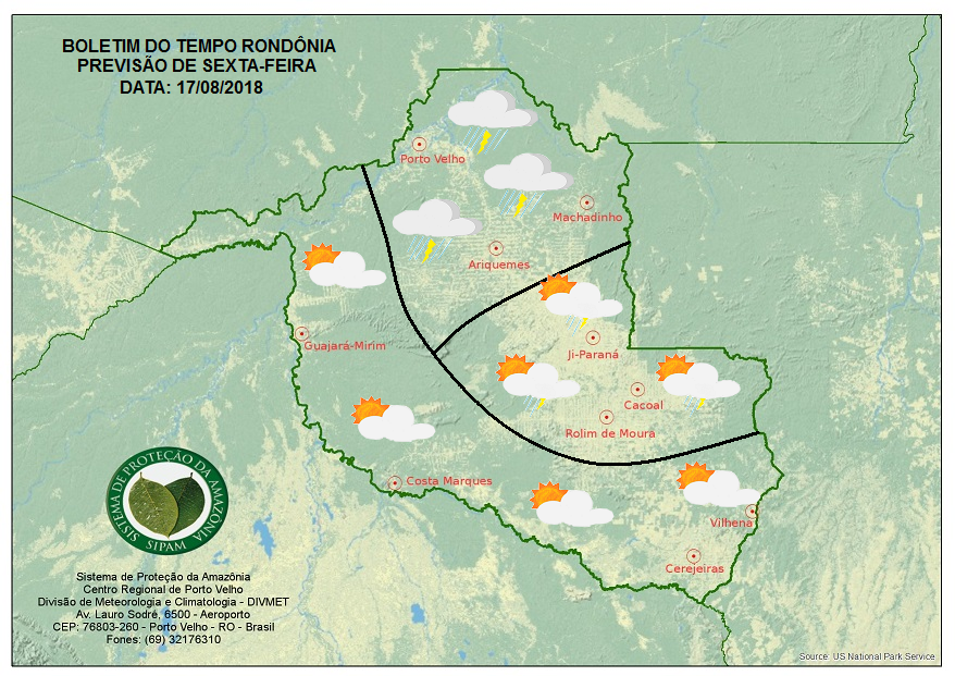 O calor fica mais forte em Rondônia nesta sexta-feira. A previsão é de um dia de tempo abafado na capital e no Vale do Jamari, com sol aparecendo sempre entre nuvens e com pancadas de chuva e trovoadas a partir da tarde.
