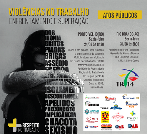 A Justiça do Trabalho realizará nos dias 24 e 31 de agosto, nas capitais Porto Velho (RO) e Rio Branco (RO), respectivamente, atos públicos em alusão ao tema “Violências no trabalho: enfrentamento e superação”.