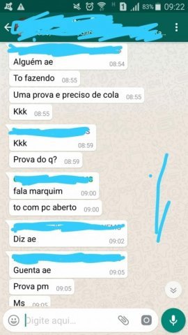 Os prints de uma conversa em grupo de WhatsApp que supostamente seria de um candidato pedindo “cola” durante a prova do concurso da Polícia Militar de Mato Grosso do Sul, aplicada no último domingo, 12 de agosto, começou a circular nas redes sociais. No diálogo, o candidato pede a resposta das questões. “Alguem ae. To fazendo uma prova e preciso de cola. Manda número da questão e a letra”, teria direito o candidato no aplicativo.