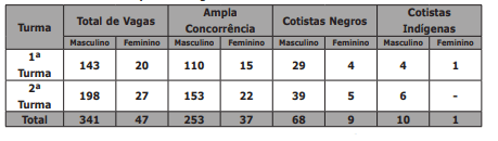 Sexo Masculino: 341 (trezentas e quarenta e uma) vagas;