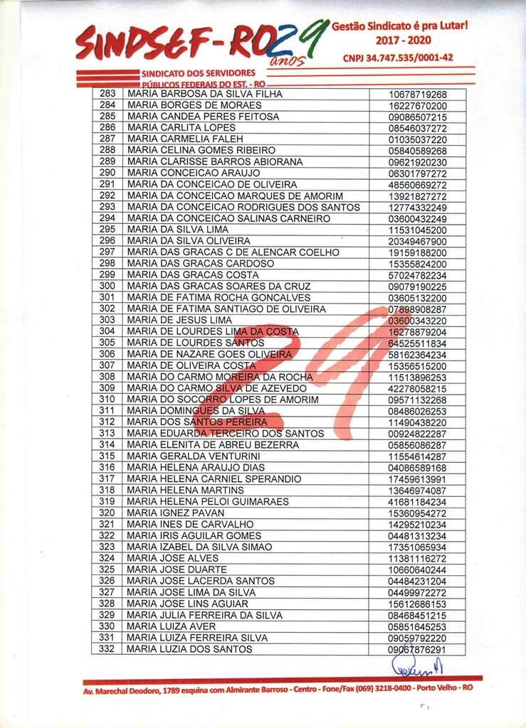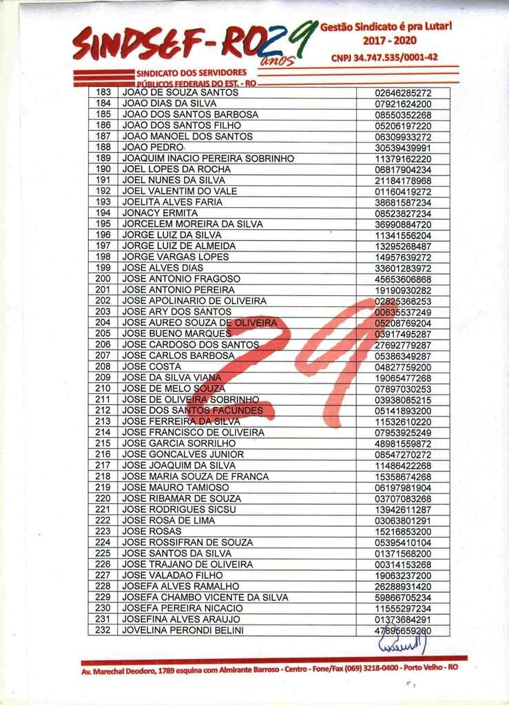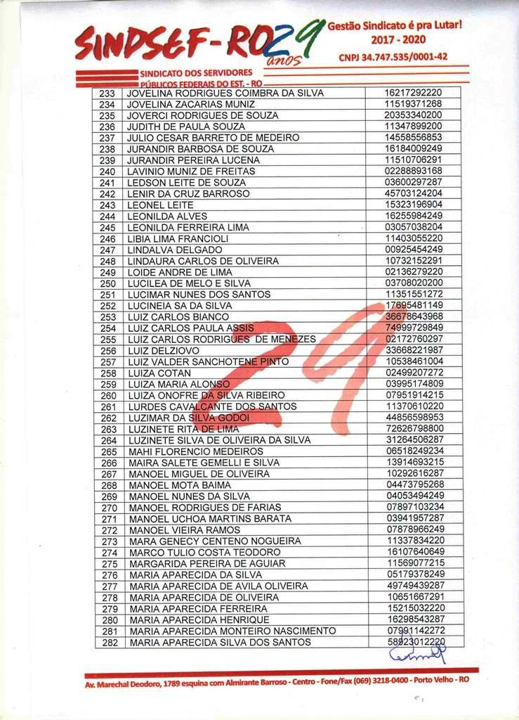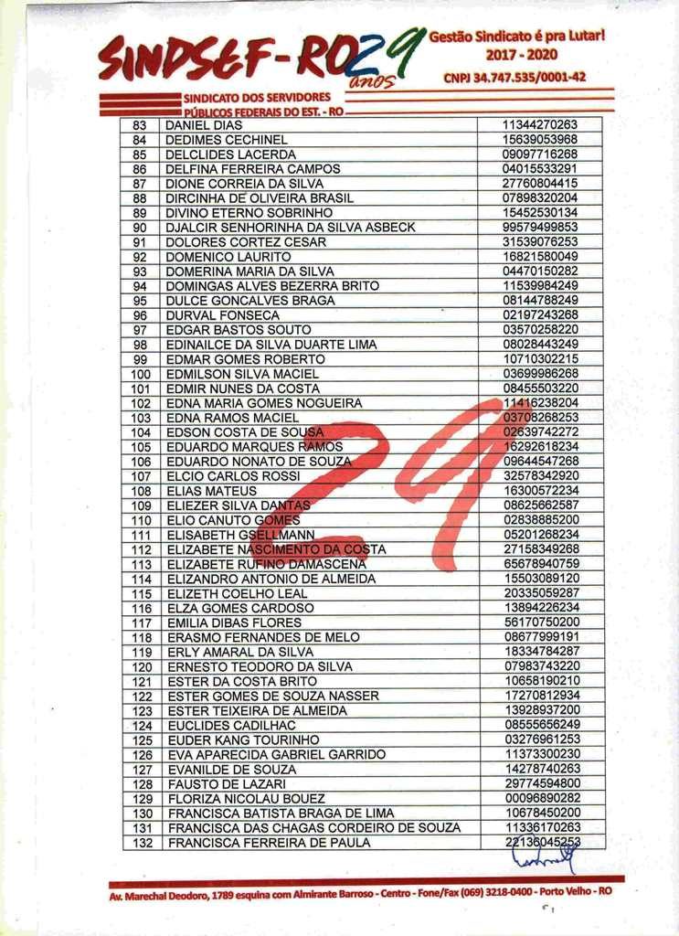 O Sindicato dos Servidores Públicos Federais no Estado de Rondônia – Sindsef-RO, convoca os beneficiários relacionados no edital abaixo ou seus herdeiros, no caso de falecidos, para que comparecerem ao sindicato para receber os créditos provenientes da ação judicial contra a seguradora Sul América.