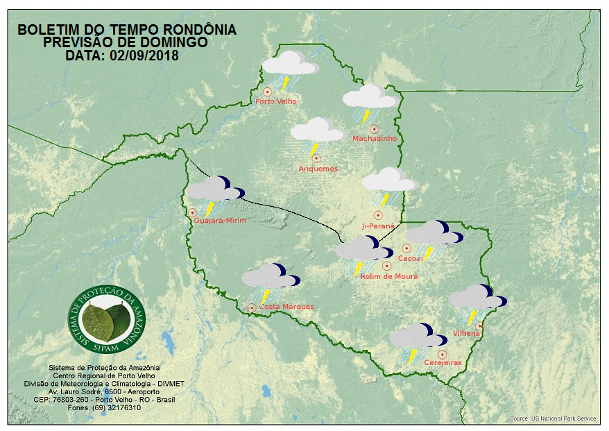 A Divisão de Meteorologia do Sistema de Proteção da Amazônia informa que uma frente fria avança pelo Sul e Sudeste do País provocará aumento de instabilidades em todo o sul da Amazônia, inclusive em Rondônia. No sábado o sol ainda brilha forte em todo o Estado e a previsão é de céu claro a parcialmente nublado em quase todas as regiões rondonienses, incluindo a capital. Apenas no Vale do Guaporé é que o tempo varia de parcialmente nublado a nublado. Em todo o Estado, no período da tarde e noite, pode ocorrer com pancadas isoladas de chuva e trovoadas.
