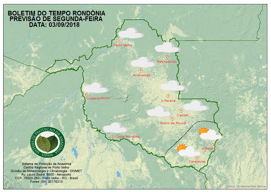 A Divisão de Meteorologia do Sistema de Proteção da Amazônia informa que a semana começa com temperaturas amenas em todo o Estado. A previsão é de céu nublado a parcialmente nublado e sem previsão de chuva na região da capital, do Vale do Jamari, do Vale Guaporé, região central e da Zona da Mata. Nas demais regiões do Estado o tempo já começa a abrir, com poucas nuvens no céu e também não há previsão de chuva. O sol até aparece, mas ainda não fará calor, devido a permanência dos ventos da massa de ar polar, que manterá a temperatura amena durante a tarde e fria durante a noite e madrugada em todo o Estado.