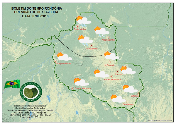 A Divisão de Meteorologia do Sistema de Proteção da Amazônia informa que o feriado será de céu claro e poucas nuvens em todo o Estado. Na região norte um pequeno aumento na umidade relativa do ar, muda o tempo nessa sexta-feira, podendo causar chuvas em áreas isoladas nessa região. Nas demais áreas o tempo segue firme e sem chuva e com a umidade relativa do ar ainda em estado de alerta com valores próximos dos 15%.