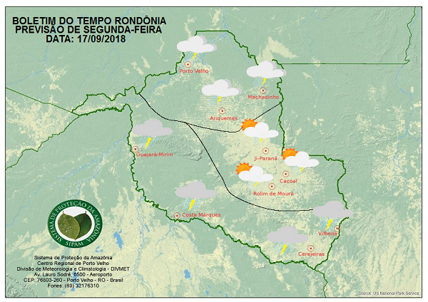 A Divisão de Meteorologia do Sistema de Proteção da Amazônia informa que a instabilidade aumenta um pouco em Rondônia neste início de semana. A previsão é de céu nublado nas cidades do Vale do Guaporé e Sul do Estado, com sol entre muitas nuvens e pancadas de chuva com trovoadas a partir da tarde. Para a região do Vale do Jamari e no Norte do Estado, inclusive na Capital, o sol aparece entre algumas nuvens e o tempo fica abafado. Entre a tarde e à noite ocorrem pancadas isoladas de chuva com trovoadas. Nas demais regiões rondonienses, o sol predomina durante todo o dia e faz bastante calor. Entre a tarde e à noite algumas nuvens ficam carregadas e provocam pancadas isoladas de chuva com trovoadas.