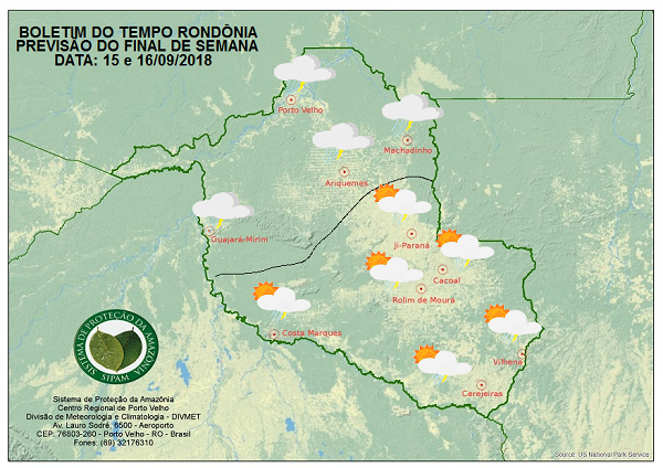 A Divisão de Meteorologia do Sistema de Proteção da Amazônia informa que o sol e o calor predominam sobre Rondônia neste fim de semana. Tanto no sábado quanto no domingo a previsão será de céu parcialmente nublado a nublado, com tempo abafado e pancadas isoladas de chuva com trovoadas a partir da tarde na capital, no Vale do Jamari e no Vale do Guaporé. Nas demais regiões do estado o tempo varia de claro a parcialmente nublado e há previsão de pancadas isoladas de chuva com trovoadas a partir da tarde.