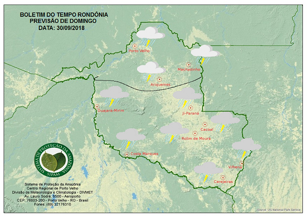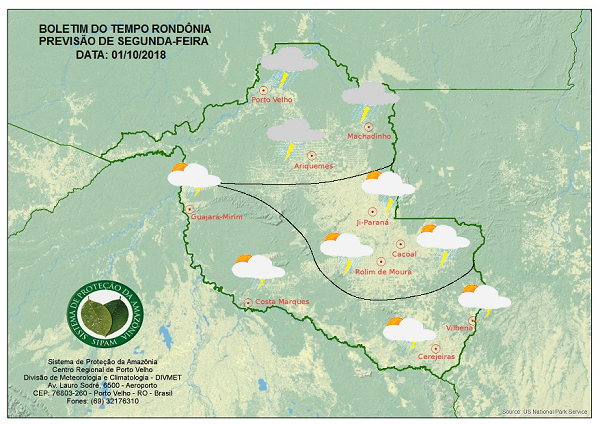 A Divisão de Meteorologia do Sistema de Proteção da Amazônia informa que a semana começa com muitas nuvens nos céus de Rondônia. Há previsões de pancadas de chuvas e trovoadas em grande parte do Estado com exceção do vale do Guaporé, Mamoré e Cone Sul. Nessa região as pancadas e trovoadas acontecem de forma isolada. O tempo varia de parcialmente nublado a nublado em todo o centro-sul do Estado. No centro-norte, inclusive na Capital do Estado e céu permanecerá nublado durante todo o dia.