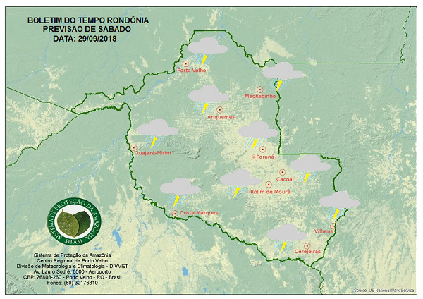 A Divisão de Meteorologia do Sistema de Proteção da Amazônia informa que o tempo em todo Estado de Rondônia deve permanecer nublado durante todo o dia. A previsão é de pancadas de chuvas e trovoadas por todas as regiões.