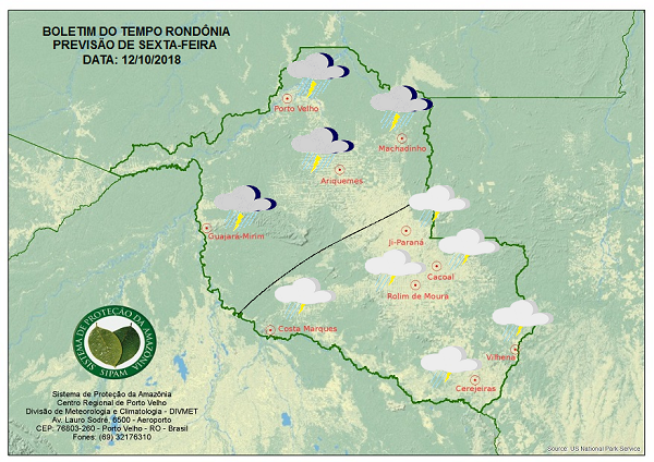 A Divisão de Meteorologia do Sistema de Proteção da Amazônia informa que a sexta-feira será de muita instabilidade por todo o Estado. O centro-norte e oeste Rondoniense terá o céu variando de nublado a encoberto. Nessa região ocorrem pancadas de chuvas e trovoadas. Há possibilidades de temporais e ventos fortes nessa região. No centro-sul do Estado as chuvas ocorrem em forma de pancadas isoladas que podem ser seguidas de trovoadas. Nessa região o céu deve variar de parcialmente nublado a nublado.