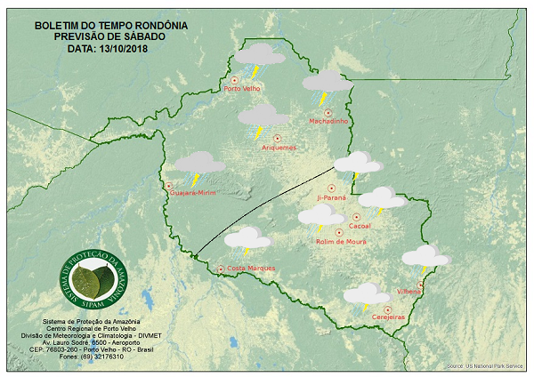 A Divisão de Meteorologia do Sistema de Proteção da Amazônia informa que o tempo pouco mudo no Estado. O céu permanecerá variando de parcialmente nublado a nublado em todo centro-sul do Rondoniense, Nessa região as chuvas ocorrem como pancadas isoladas seguidas de trovoadas. Nas demais áreas do centro-norte e do oeste, inclusive na Capital Porto Velho, o céu permanecerá nublado. A previsão é de pancadas de chuvas e trovoadas para esse sábado.