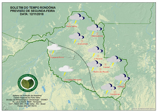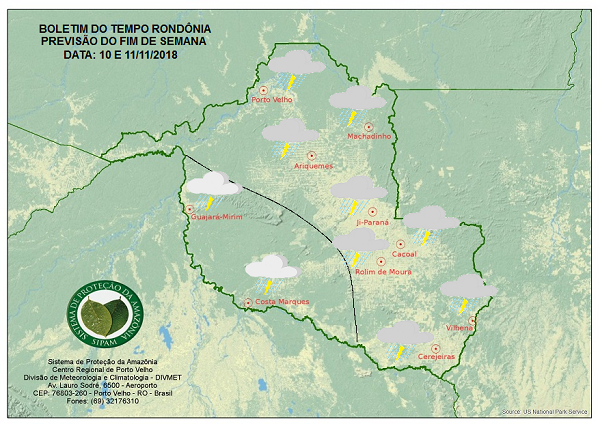 A Divisão de Meteorologia do Sistema de Proteção da Amazônia informa que a instabilidade atmosférica é presente em todo o Estado nesse fim de semana. Há riscos de chuvas fortes em várias regiões. Nos vales do Guaporé e Mamoré, o céu varia de parcialmente nublado a nublado, nas demais áreas do Estado o tempo permanecerá nublado durante todo o fim de semana. A previsão é de chuvas em forma de pancadas, seguidas de trovoadas.